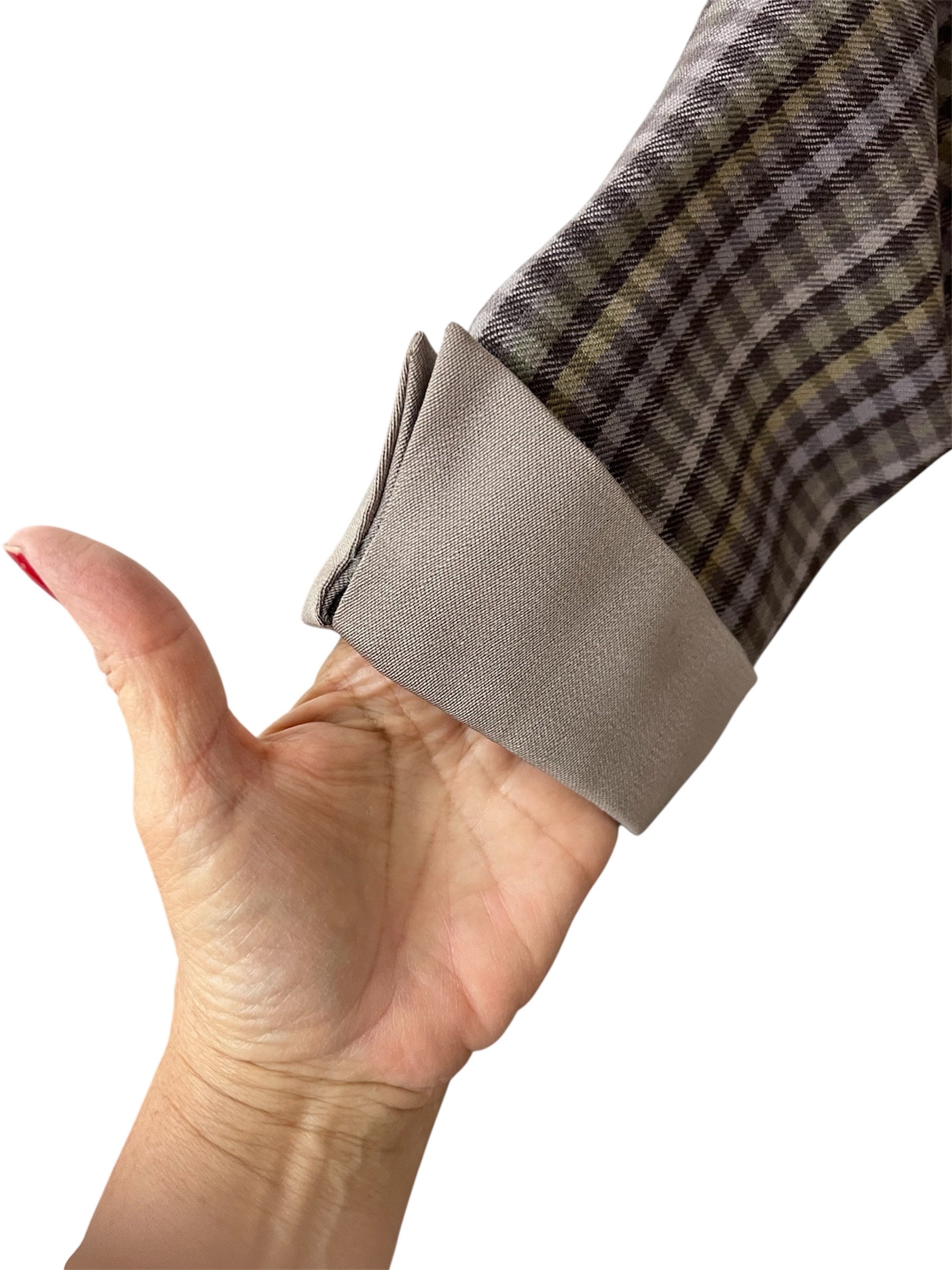 Here's a gorgeous beauty. This is a great 1940's 1950's in the Lilli Ann style two tone check jacket in colors of taupe, brown, yellow and gray. It has nice wide shoulder pads, front flap pockets and five original covered buttons which are all intact. Color is in perfect condition with no fading or discoloration. NO repairs, holes or tears just perfect. I did notice two very tiny spots on the front of the jacket which I believe will come out with a dry cleaning. Other than that this jacket overall is in very good to excellent vintage condition. This is such a great design.