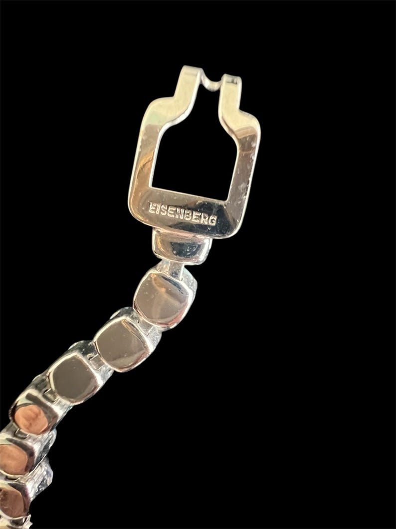 This set is just perfect and gorgeous. 1950's Art Deco waterfall Eisenberg set which consist of the necklace and matching earrings. This set is so lovely with the blue, lavender and crystal clear rhinestones. All set on silver tone metal. All just gorgeous and in the most beautiful vintage condition. From what I see there are no missing stone, discoloration or damage to the stones or metal. The clips and the clasp on the necklace are all in perfect working order. Really gorgeous. All are stamped on the back with the Eisenberg logo.