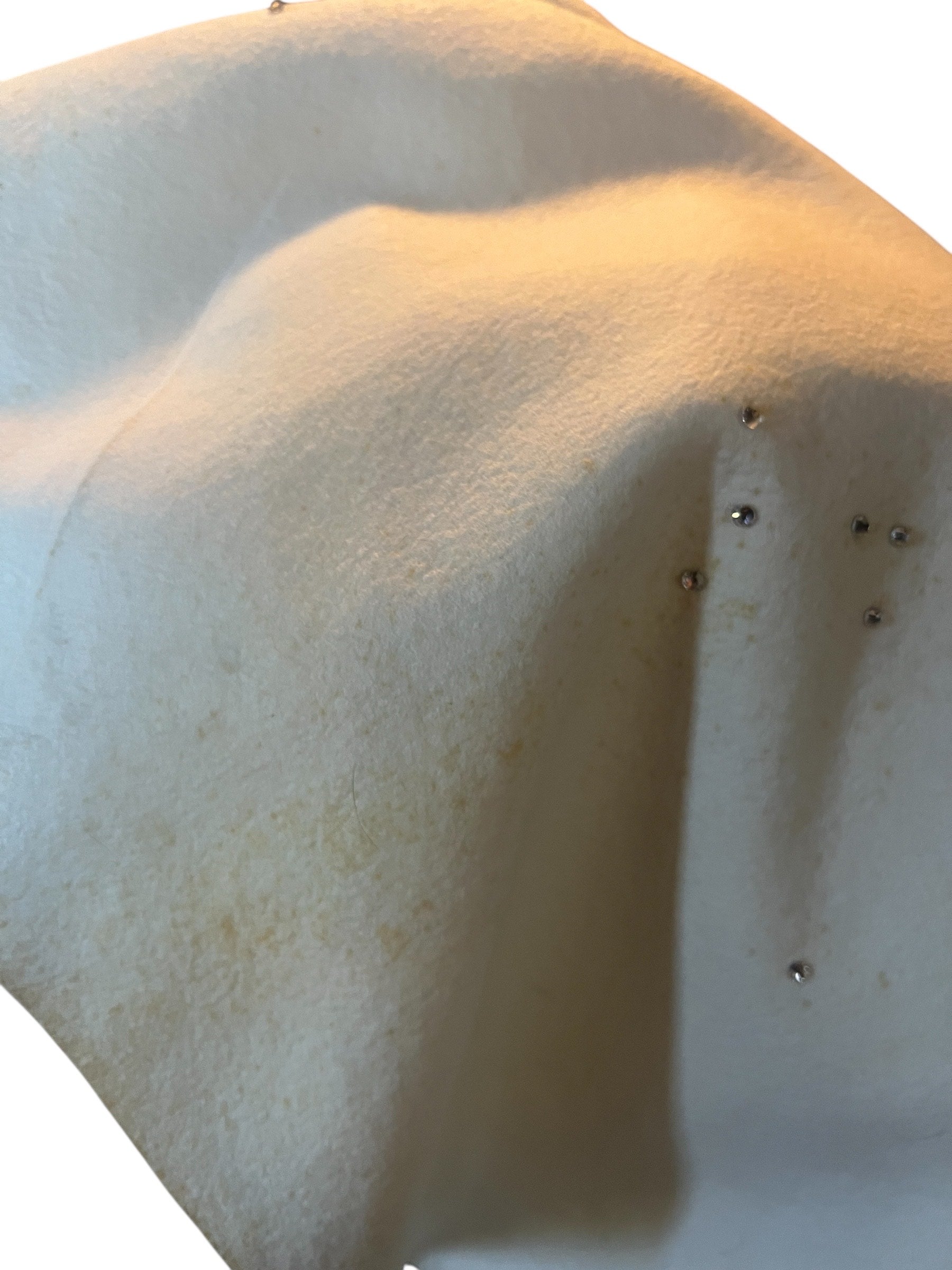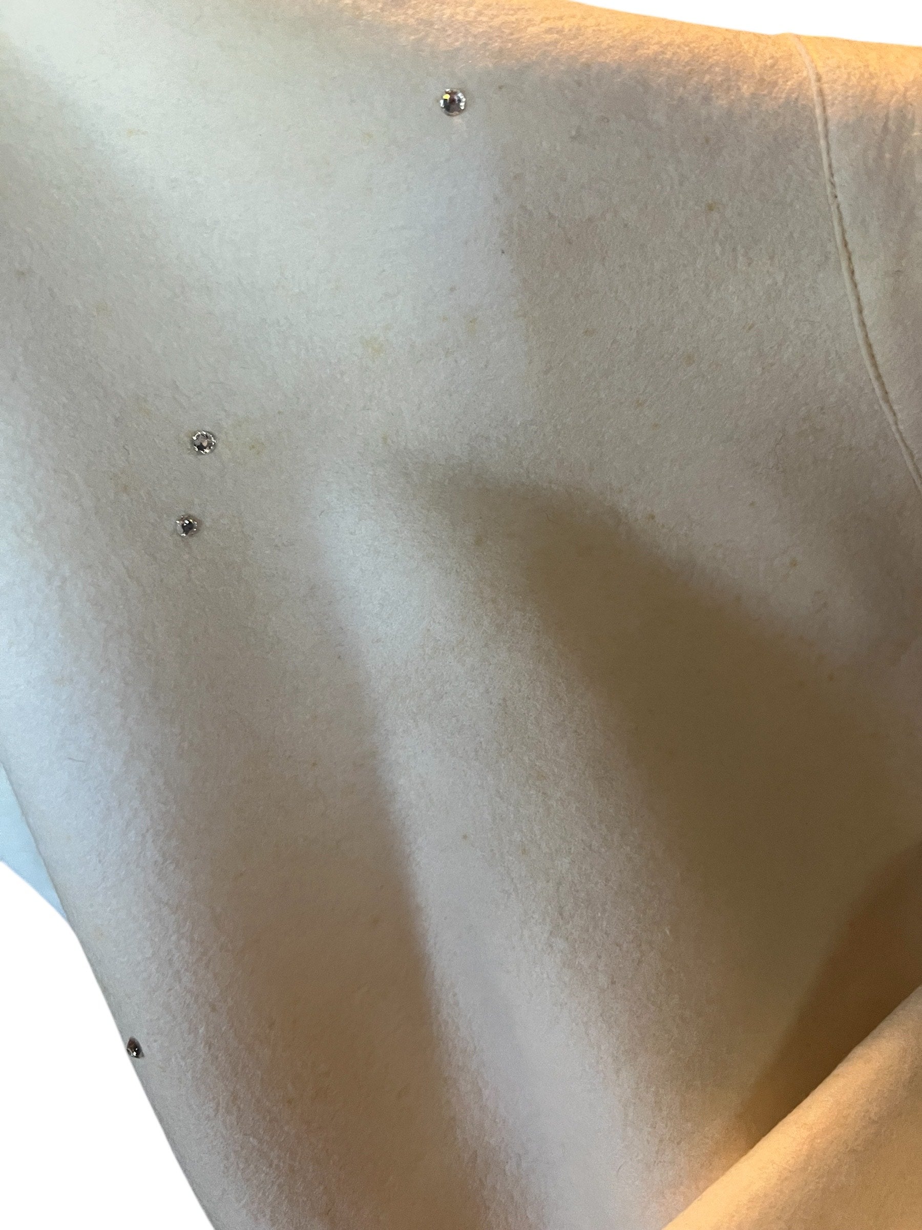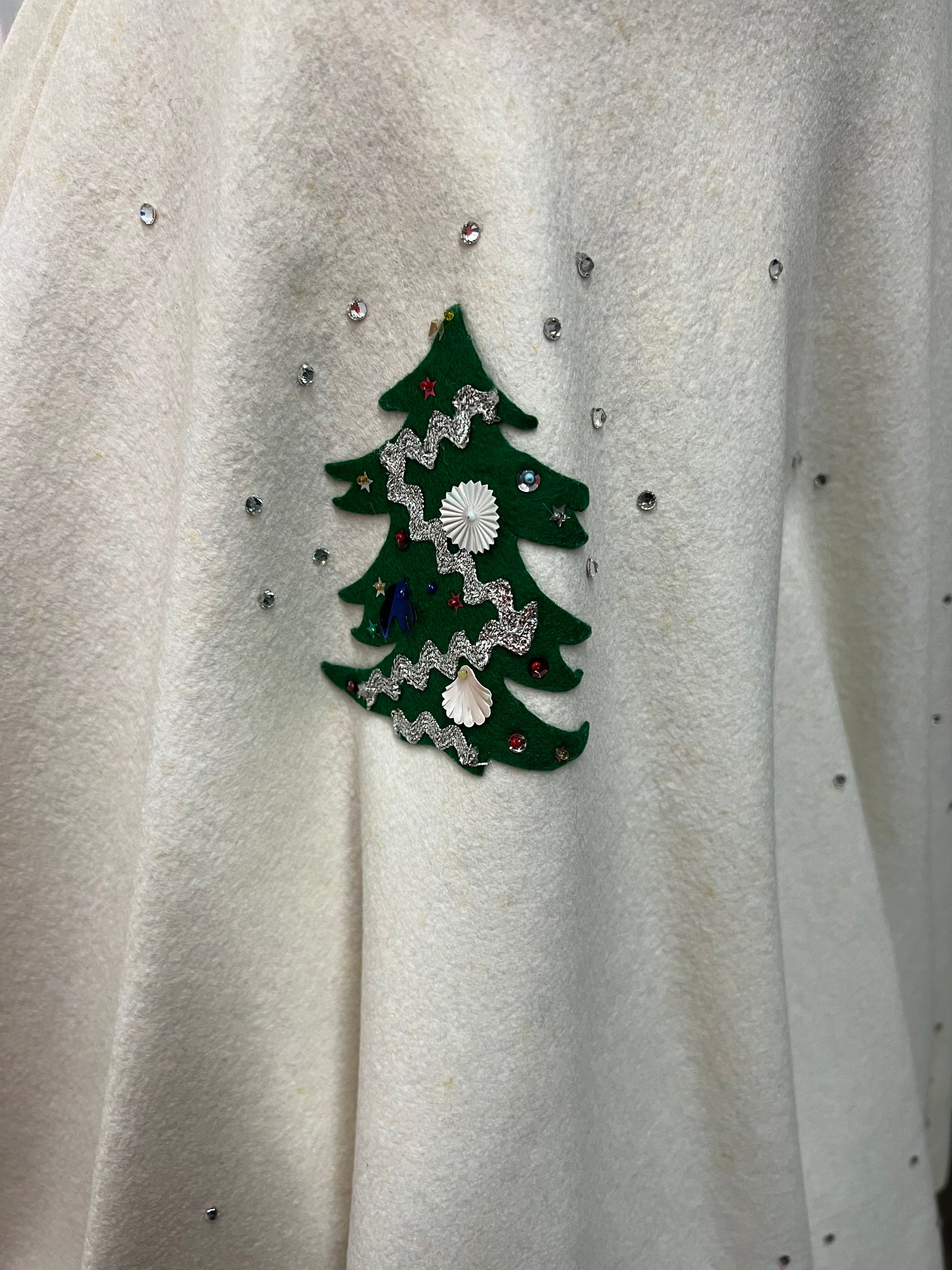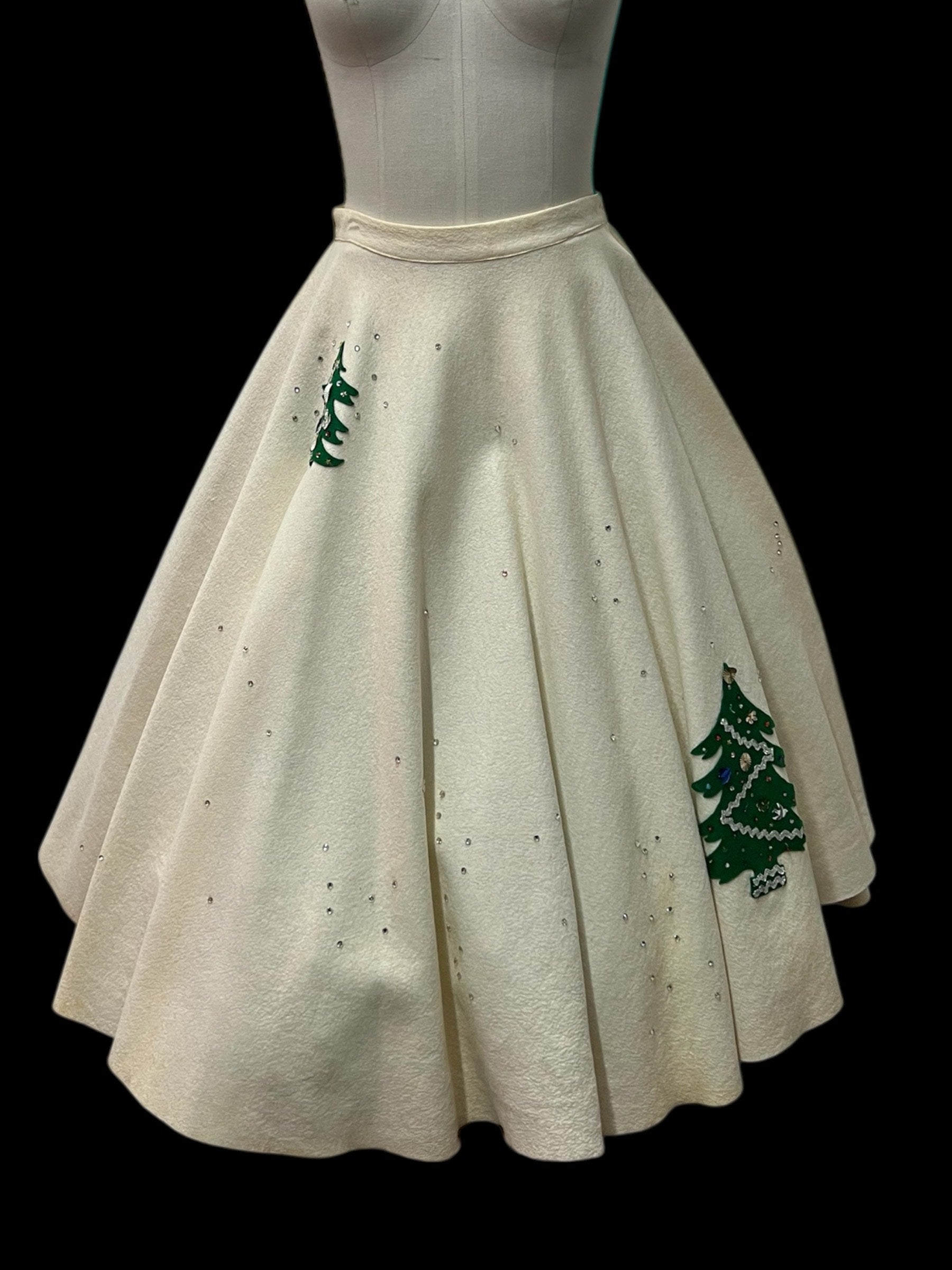I just got this in and wanted to post it for the Holidays. This gorgeous whimsical 1950's full circle wool felt Christmas skirt is just fabulous. Beautiful cream off white color full of rhinestones, sequins, beads and rick rack on two whimsical green embellished Christmas trees. All embellishments on the trees and the rhinestones are intact. I don't see any missing. This shirt is just amazing with no holes at all or snags. I do need to mention there are very faint pale tiny spots here and there throughout the skirt. Really not noticeable when worn. Being a circular skirt and with all the rhinestones scattered throughout you don't really notice the light tiny spots but, I did need to mention it.