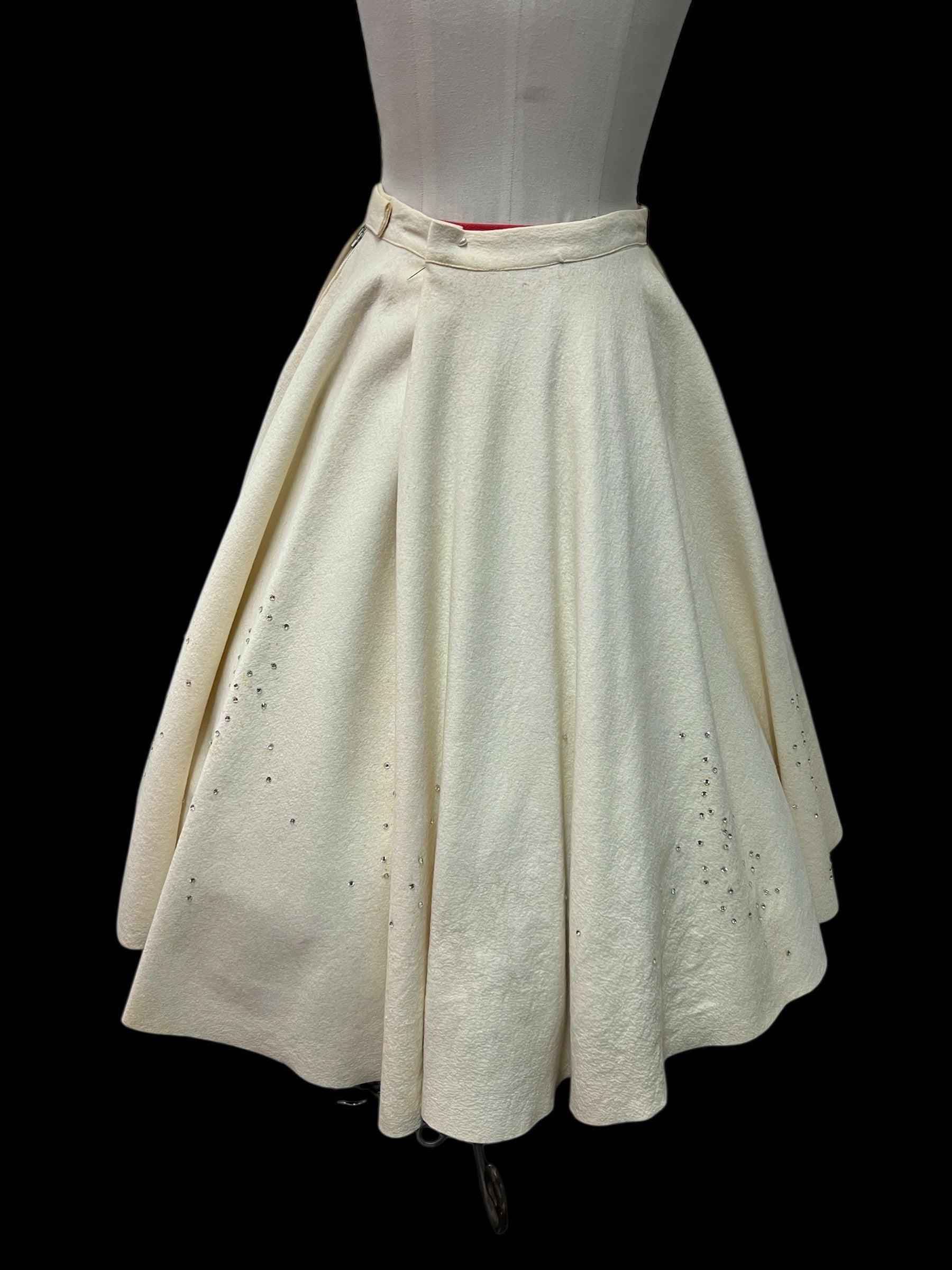 SOLD! 1950's Vintage Christmas Circular Cream Skirt with Xmas Tree Appliques and Rhinestones